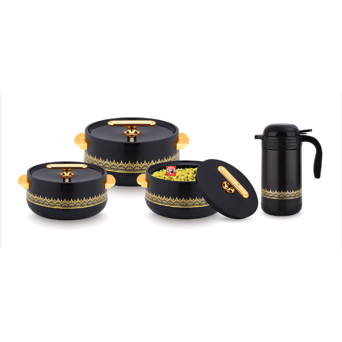 Sizes- 4 Pcs set: Casseroles: 3 pcs , Flask- 1 pc