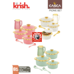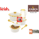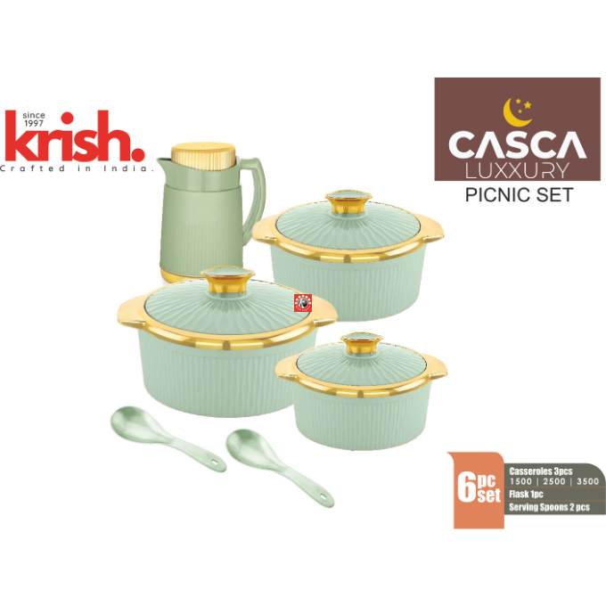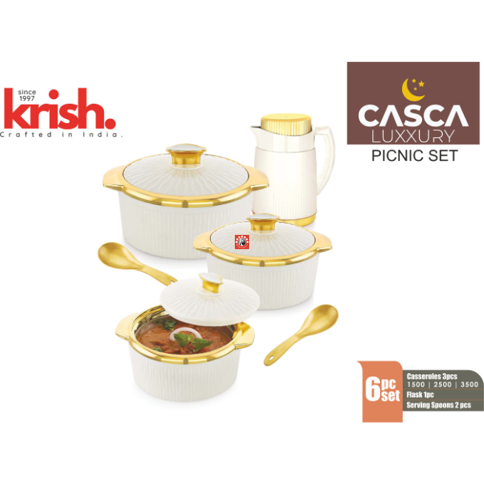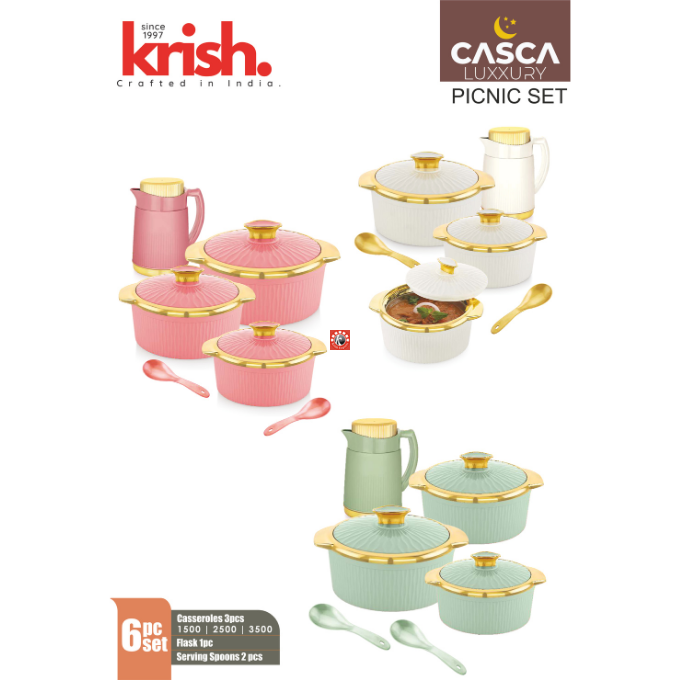 Sizes-6 pcs set: Casseroles: 1500/2500/3500, Flask- 1 pc, Serving Spoons- 2 pc