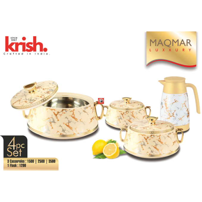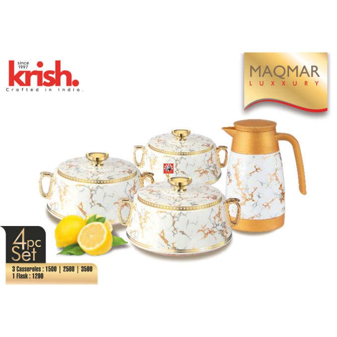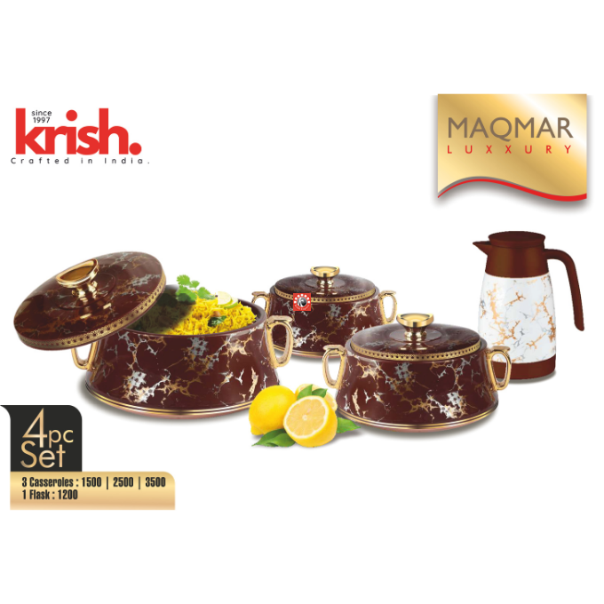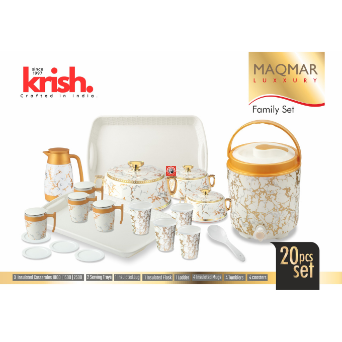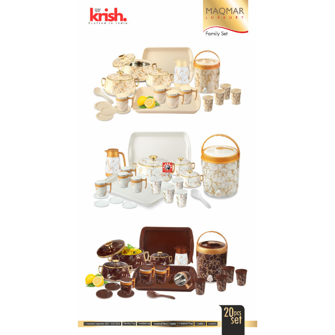 Sizes-4 pcs set: Casseroles- 1500/2500/3500 ml, Flask- 1200 ml, 20 pcs set- Casseroles- 1500/2500/3500 ml, Flask- 1 pc, 2 serving Trays, Insulated Jug- 1 pc, Ladder- 1 pc, Insulated Mugs- 4 pcs, Tumblers- 4 pcs, Coasters- 4 pcs