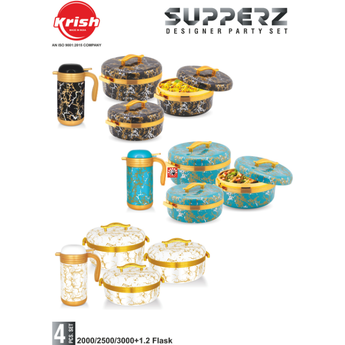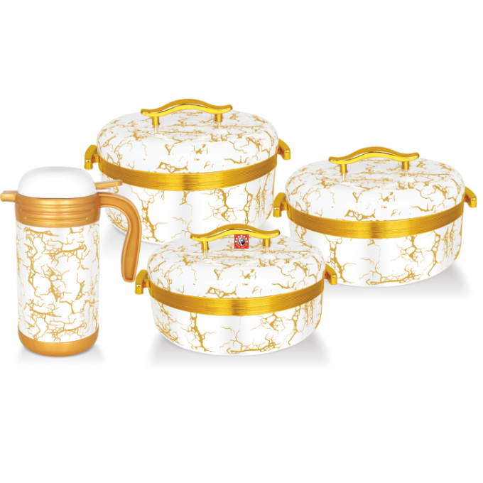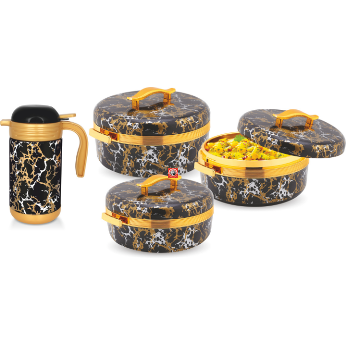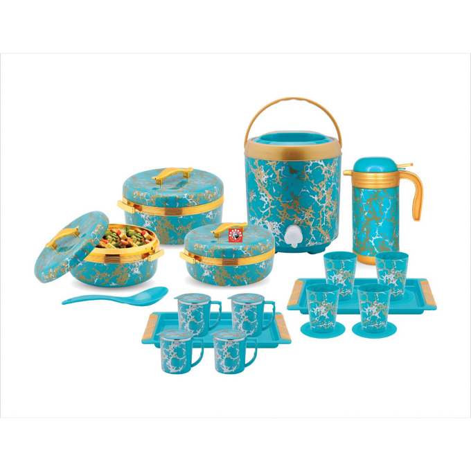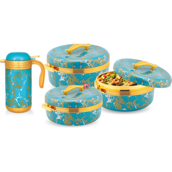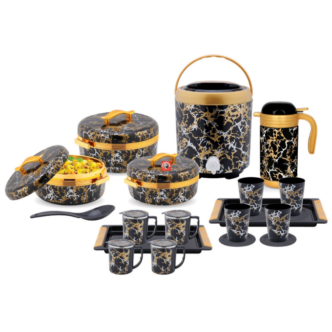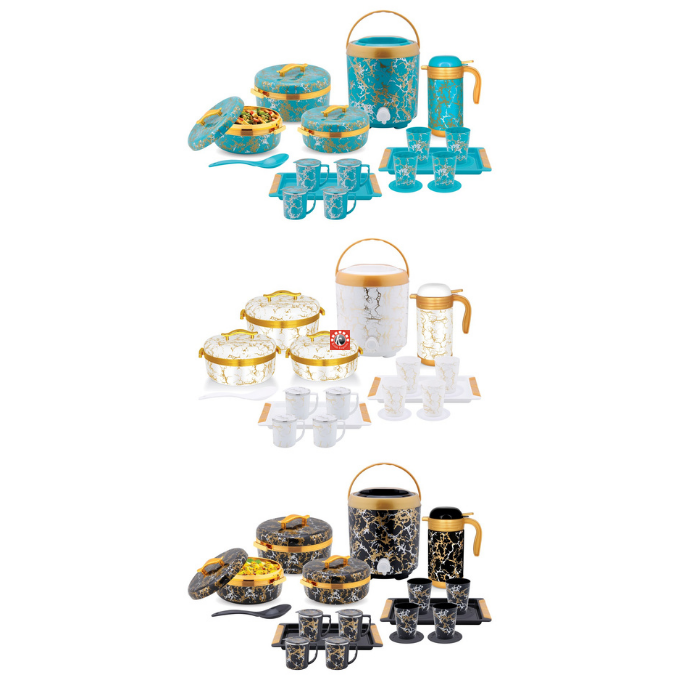 Sizes-4 pcs set- Casseroles- 2000/2500/3500 ml, Flask- 1200 ml, 20 Pcs Set: Casseroles- 3 pcs, Flask- 1 pc, Tray- 2 pcs, Glasses- 4 pcs, Tea Mug- 4 pcs, Coasters- 4 pcs, Spoon- 1 pcs, Water Jug- 1 pcs