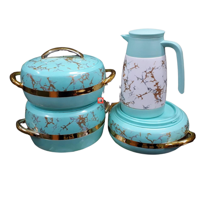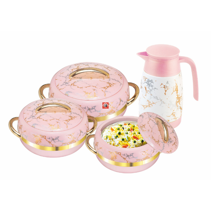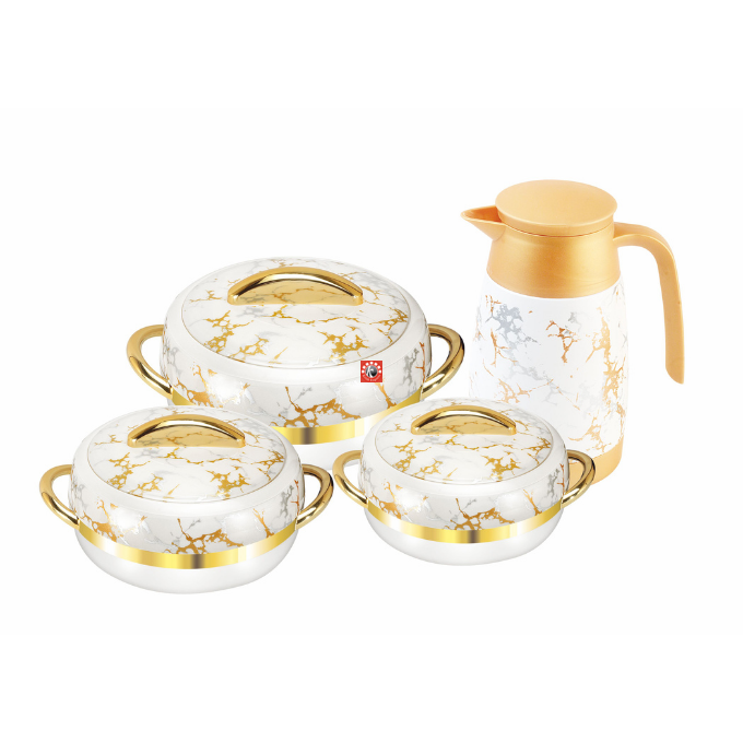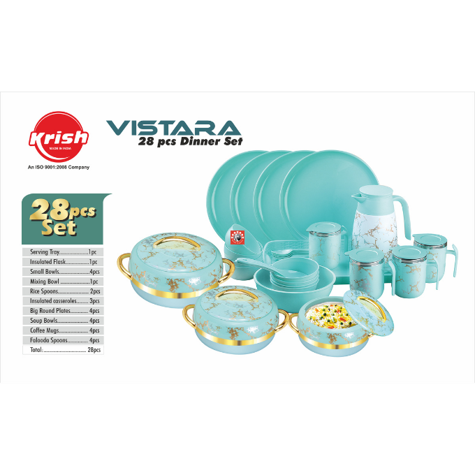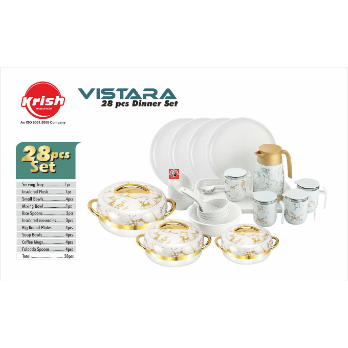 Sizes-4 pcs set: Casseroles- 3 pcs, Flask- 1 pc, 28 pcs dinner set: Casseroles- 3 pcs, Serving Tray- 1 pc, Flask- 1 pc, Small Bowls- 4 pcs, Mixing Bowls- 1 pc, Rice Spoons- 2 pcs, Big Round Plates- 4 pcs, Soup Bowls- 4 pcs, Coffee Mugs- 4 pcs, Falooda Spoons- 4 pcs